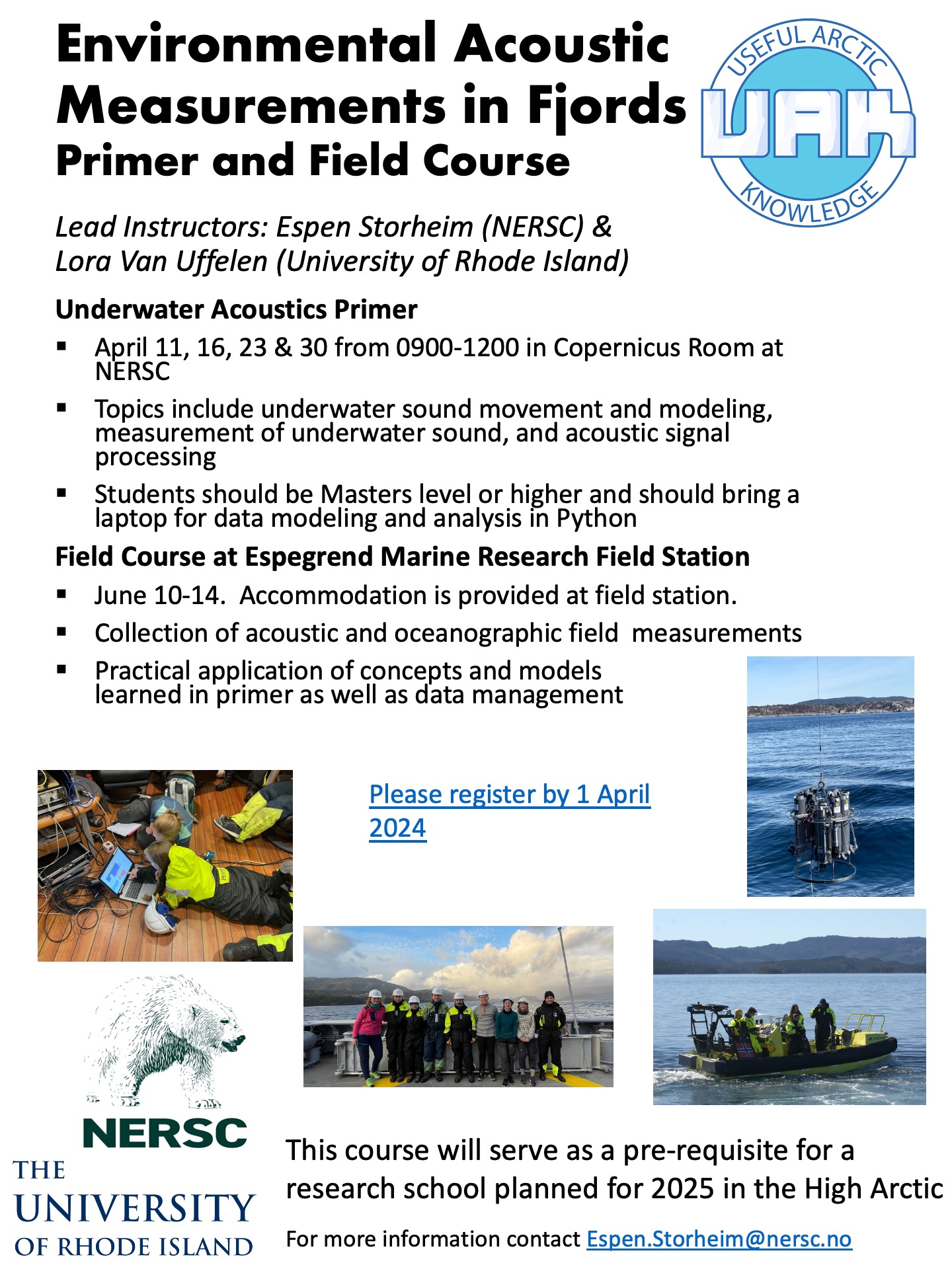The acoustics primer was taught with the intention that students learn the basics of underwater acoustics in a classroom setting, thus enabling them to get the most out of their experience in the field. This allowed the students to take part in planning the fieldwork and maintained a focus on collecting high quality data. In the primer they were also introduced to the software needed for data processing and modelling so that they could bring this experience with them and incorporate real data in the field environment. Six students participated and four of them continued with the field course.